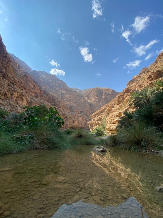 Llego a las dunas de Sharqiya, un paraje magnífico, aunque por la noche no puedo disfrutar de las estrellas porque está nublado. Con todo, lo que más me gusta del país a nivel natural son los wadis, unos oasis situados en valles, especialmente espectaculares cuando se encuentran en cañones encajonados entre altas y rectas paredes montañosas. Visito los de Beni Khalid y, ya en la costa de nuevo, el de Wadi Shab, a hora y media de Mascate.