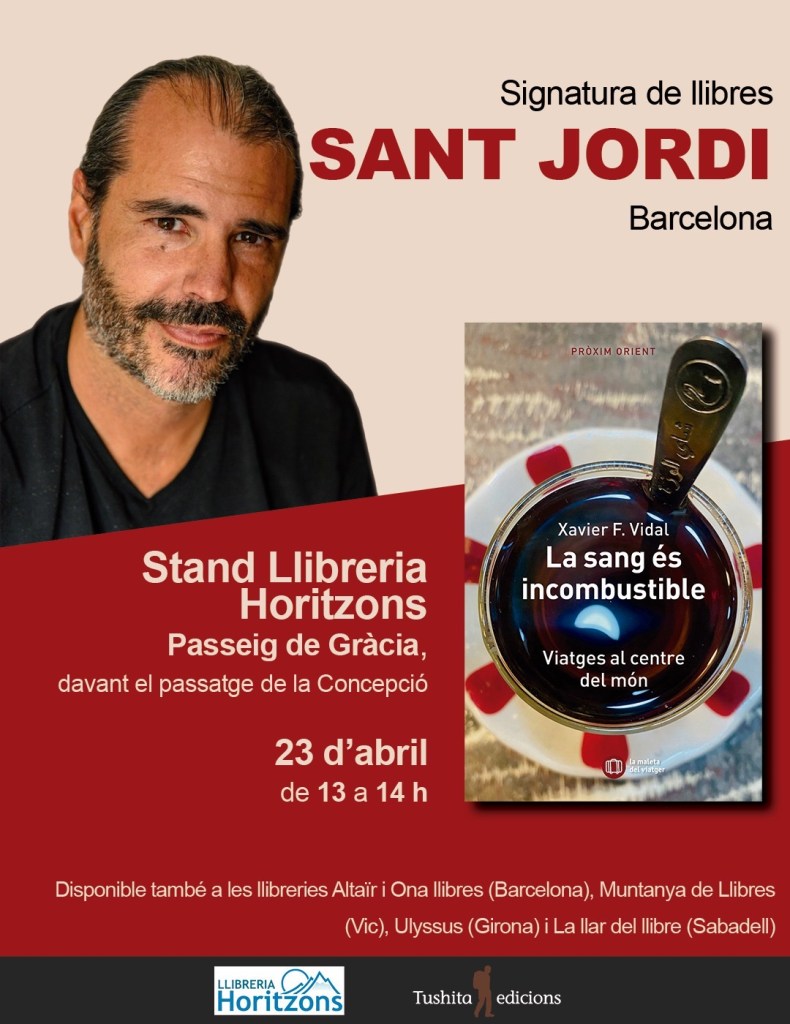 Me hace mucha ilusión anunciar que, por primera vez, estaré firmando libros en un día tan señalado. Estaré en el stand de la Llibreria Horitzons de Barcelona, en el paseo de Gràcia, delante del pasaje de la Concepció, de 13:00 a 14:00. Allí estará a la venta la edición en catalán de mi último libro, «La sang és incombustible», las crónicas de mis viajes por Oriente Medio entre en los años 2002 y 2003. El libro también se puede comprar en las librerías Altaïr (Barcelona), Muntanya de llibres (Vic) y Ulyssus (Girona), y en castellano («La sangre no arde») en Desnivel (Madrid), La botica de lectores (Sevilla), Mapas y cía (Málaga) y Patagonia (Valencia), así como en Amazon.