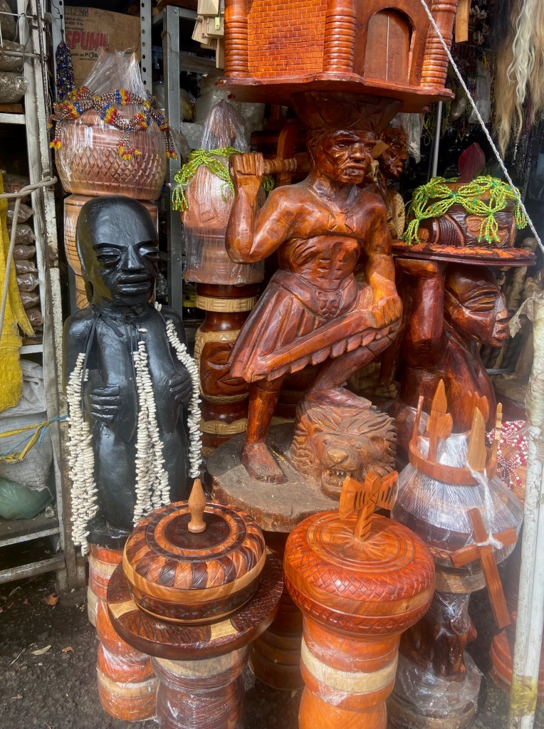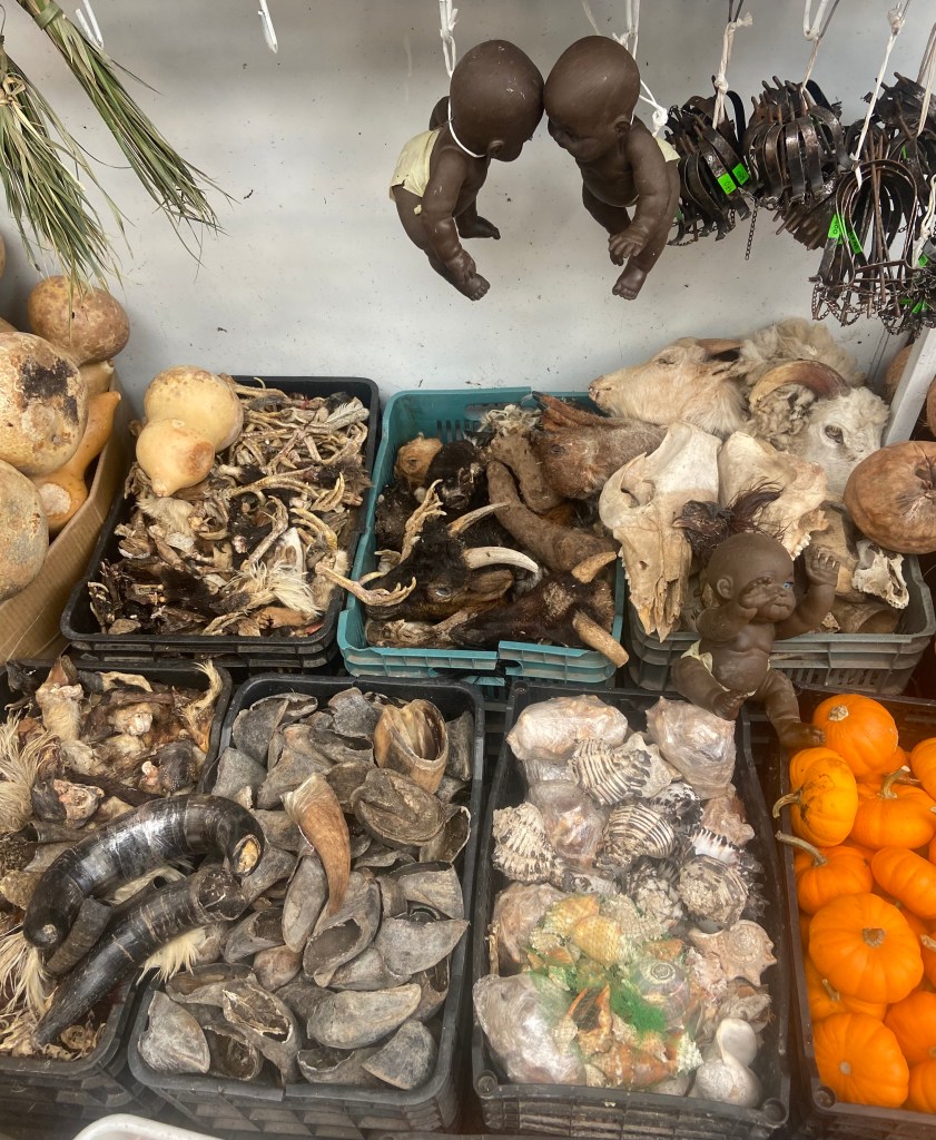 Su religión todavía pervive, y el sincretismo que se creó al mezclarse sus creencias yorubas con el cristianismo se puede ver en el Mercado de Sonora. Allí me quedé de piedra al ver toda clase de objetos para rituales y otras ceremonias, muy parecidos a los que he podido ver varias veces en Benín y también en Nigeria, pero con varias diferencias: lógicamente, los chamanes tuvieron que usar flora y fauna local, no la original africana y, así, se pueden ver, por ejemplo, cabezas de venado en lugar de mono u otros animales que no están en la región del Estado de México. Las muñecas, que dan bastante miedo y son características de la santería, sustituyen a los muñecos de la religión originaria.
